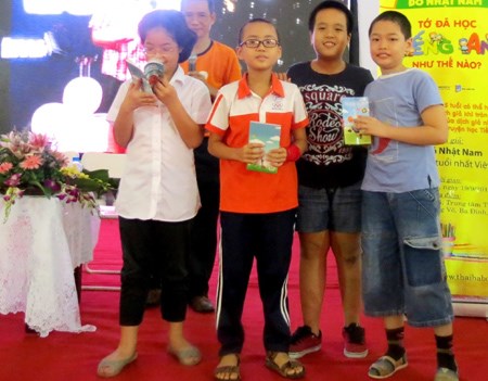 Nhật Nam (thứ hai từ phải sang) bên các độc giả nhí (Internet) |