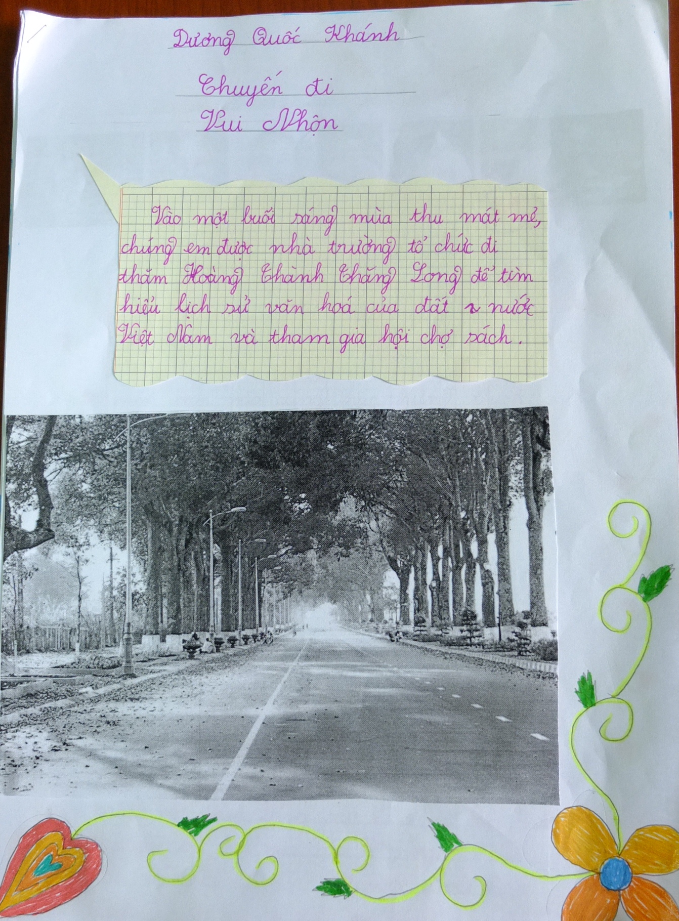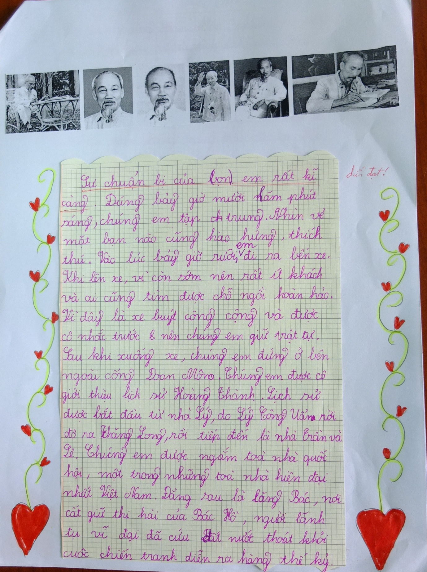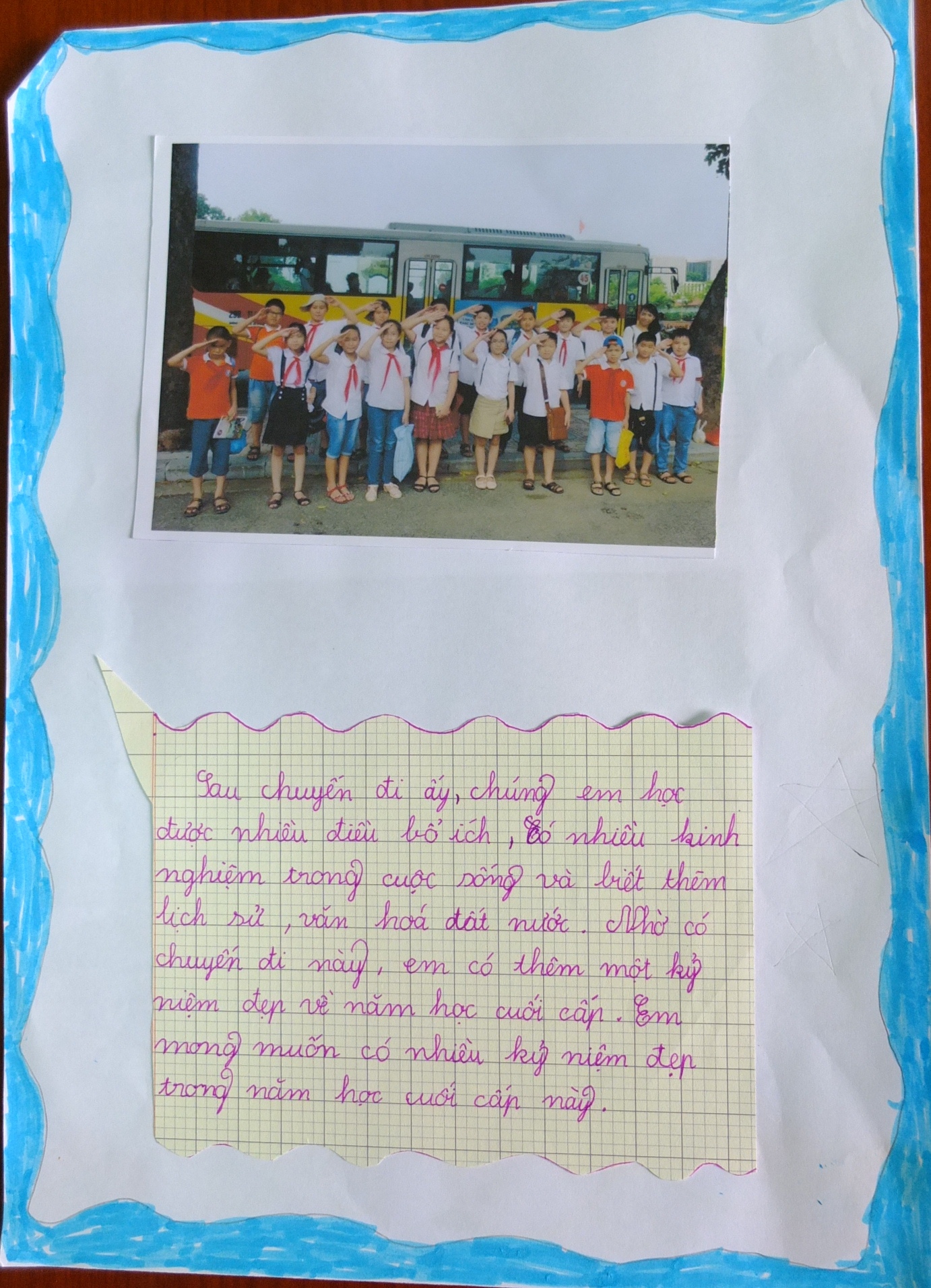 Mỗi chuyến trải nghiệm thực tế đều để lại cho các bạn nhỏ những ấn tượng khác nhau nhưng chắc chắn đó đều sẽ là những bài học bổ ích và là những kỉ niệm đẹp của tuổi học trò. Dưới đây là hình ảnh bài thu hoạch được các bạn nhỏ 5A viết và trang trí ấn tượng về chuyến trải nghiệm tại Hoàng Thành Thăng Long vừa qua. Mời các bố mẹ cùng xem và khen ngợi, khích lệ tinh thần ham học hỏi của các con nhé. 1. Bài viết của bạn Dương Quốc Khánh: 2. Bài viết của bạn Trần Mai Chi: 3. Những bài viết khác cũng đều được đầu tư công phu: