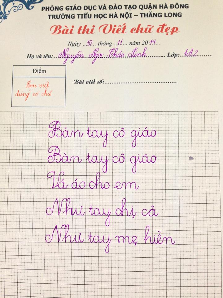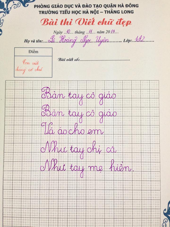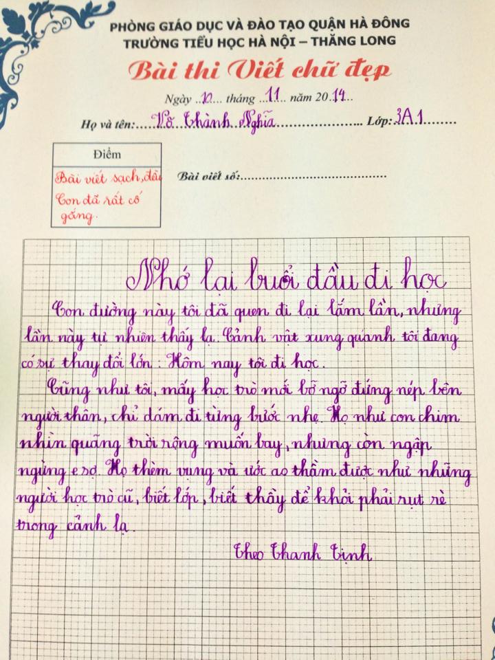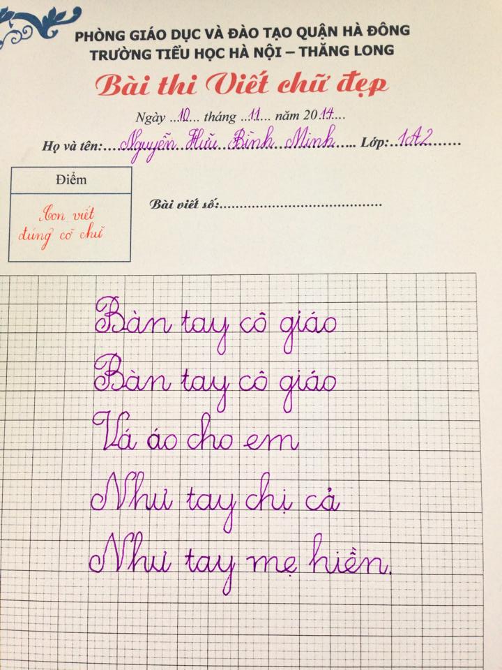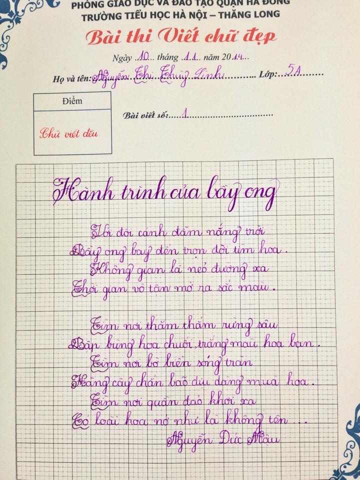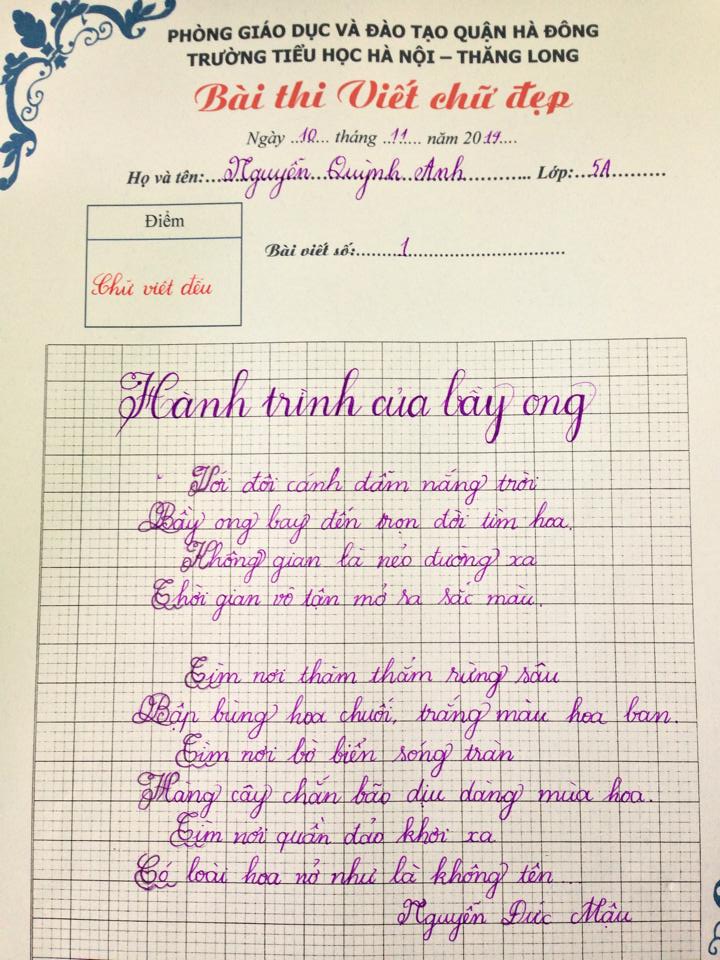 Nằm trong chuỗi các hoạt động hướng tới chào mừng ngày Nhà giáo Việt Nam 20.11, kì khảo sát viết chữ đẹp được cô trò Trường Tiểu học Hà Nội - Thăng Long nhiệt tình hưởng ứng. Sau đây là kết quả các bài viết đạt giải ba của kì khảo sát. Chúc mừng các con đã đạt giải, chúc các con luôn nỗ lực phấn đấu vươn lên trong học tập, rèn chữ, rèn người. Cùng xem các bài đạt giải 3 của cuộc thi nào: