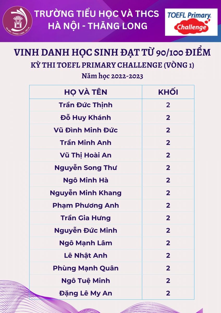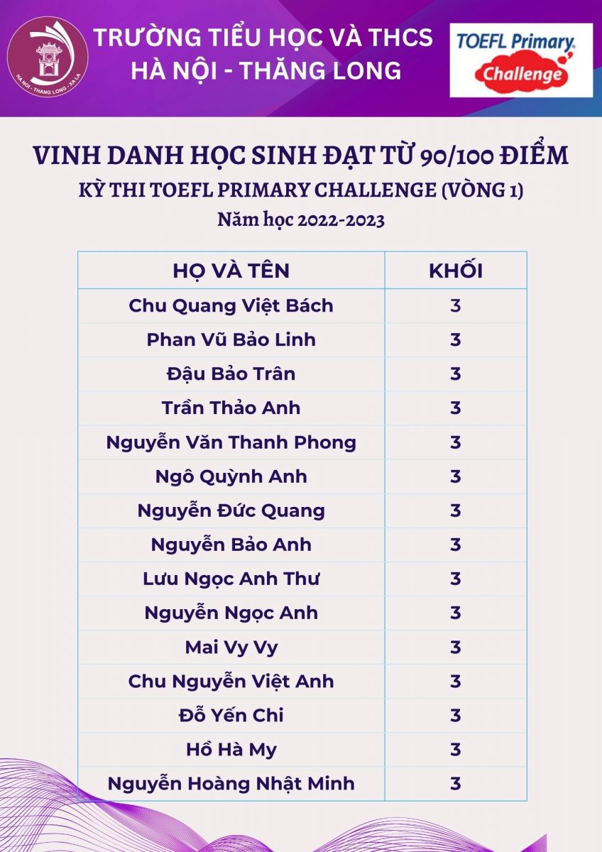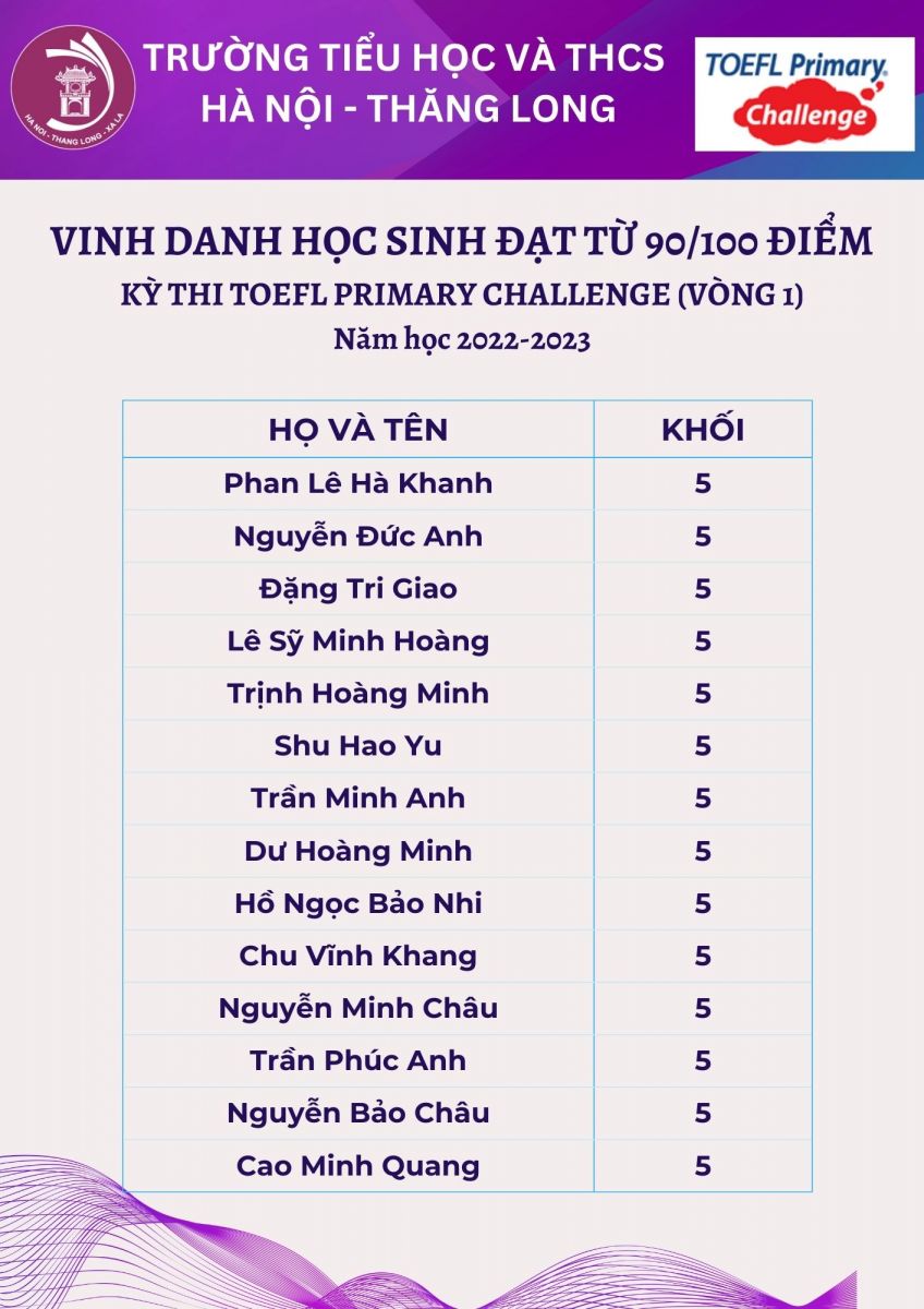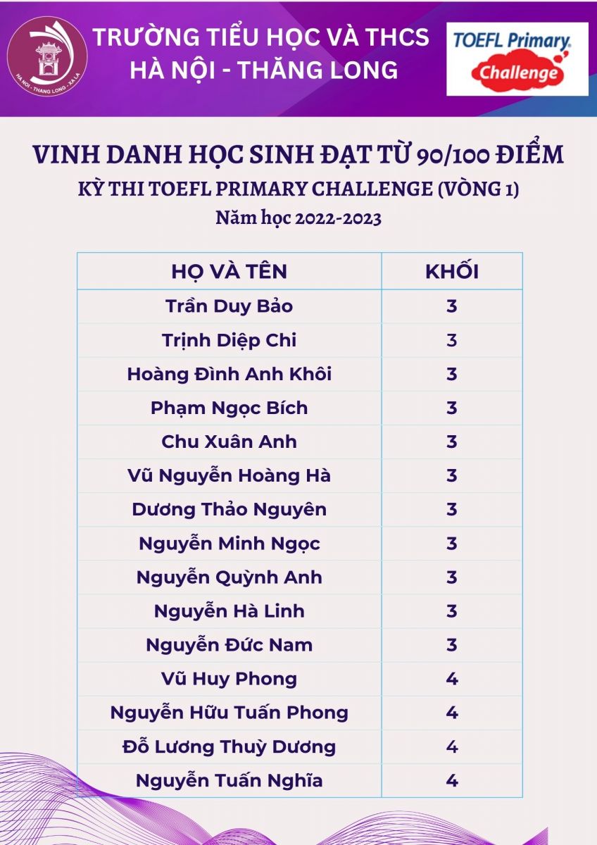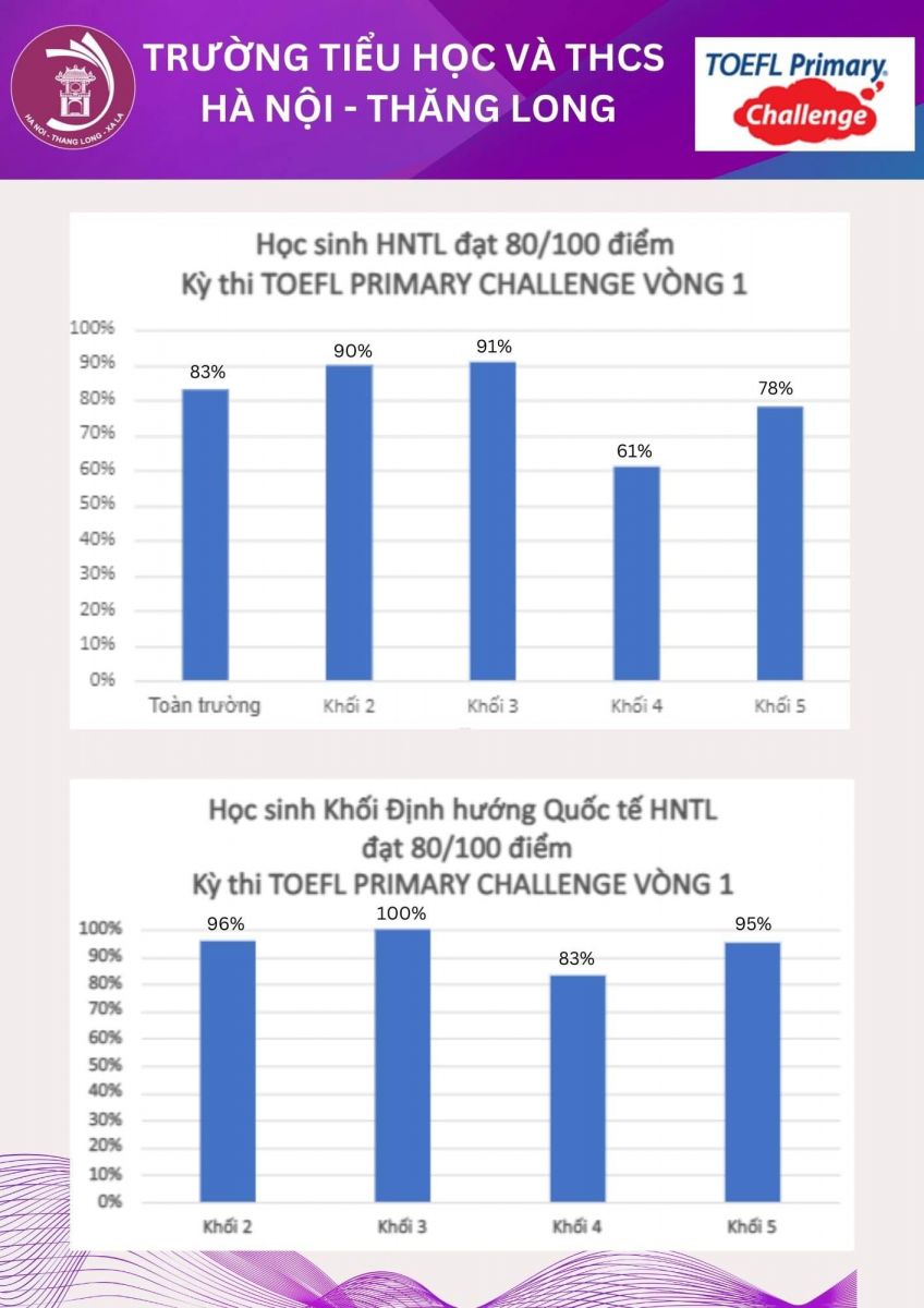 Ban Giám hiệu Trường Tiểu học và THCS Hà Nội - Thăng Long chúc mừng 166 học sinh khối tiểu học tham gia vòng 1 của cuộc thi TOEFL PRIMAY CHALLENGE (2022-2023). Thật tự hào khi tỷ lệ học sinh tiểu học HNTL đạt 80/100 điểm trở lên là hơn 83%. Riêng học sinh HNTL đạt điểm 90/100 trở lên chiếm 36%. Đặc biệt, các thầy cô chúc mừng bạn Phan Lê Hà Khanh (khối 5 hệ Định hướng Cambridge) đã đạt điểm tuyệt đối 100/100.