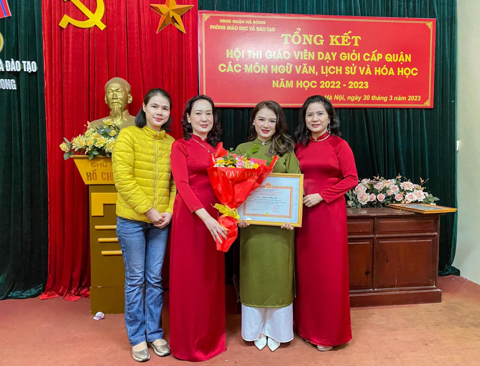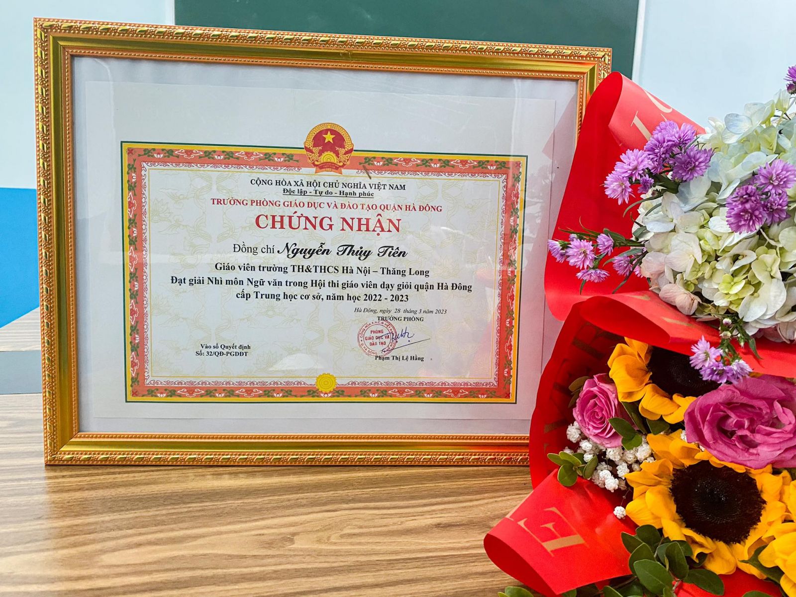 Xin chúc mừng cô Nguyễn Thủy Tiên tham gia dạy tiết Ngữ Văn và đã đạt giải Nhì trong Hội thi Giáo viên dạy giỏi cấp Quận Hà Đông các môn Ngữ văn, Lịch sử vả Hóa học (năm học 2022-2023). Theo đánh giá của Ban giám khảo, tiết học của cô Thủy Tiên đã thể hiện đúng đặc trưng bộ môn cũng như vận dụng các hình thức tổ chức dạy học đa dạng, sáng tạo ứng dụng công nghệ thông tin trong dạy học. Nhờ vậy học sinh rất hứng thú và tham gia tích cực, sôi nổi vào tiết học.