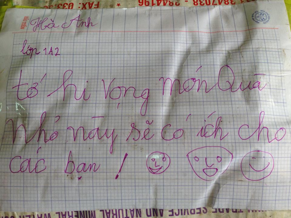 Xin cảm ơn những tấm lòng vàng của các bậc phụ huynh, đặc biệt là sự quan tâm, biết chia sẻ của các bạn học sinh trong toàn trường đến các bạn nhỏ Huyện Mèo Vạc - Tỉnh Hà Giang. Xin chia sẻ lại câu chuyện của bạn Hà Anh lớp 1A2 mà mẹ đã chia sẻ trên fb cá nhân " con đã dậy từ hơn 3h sáng để đóng thùng quà và gần 6h đã bắt bố chở đến trường để gửi quà tặng các bạn." Và đặc biệt hộp quà của bạn còn có những dòng chữ nhắn gửi rất ấm áp đến các bạn nhỏ. Chắc chắn các bạn sẽ rất vui khi nhận được những món quà của các con. Đúng là yêu thương luôn được đong đầy trong mắt con trẻ, các con đã có thêm 1 cơ hội để học về sự sẻ chia và tính tiết kiệm. Những món quà sẽ sớm đến tay các bạn nhỏ thôi, chúc các bạn sẽ có thêm nhiều động lực để tiếp tục học tập tốt. Một vài hình ảnh những dòng nhắn gửi dễ thương của các con đến các bạn: