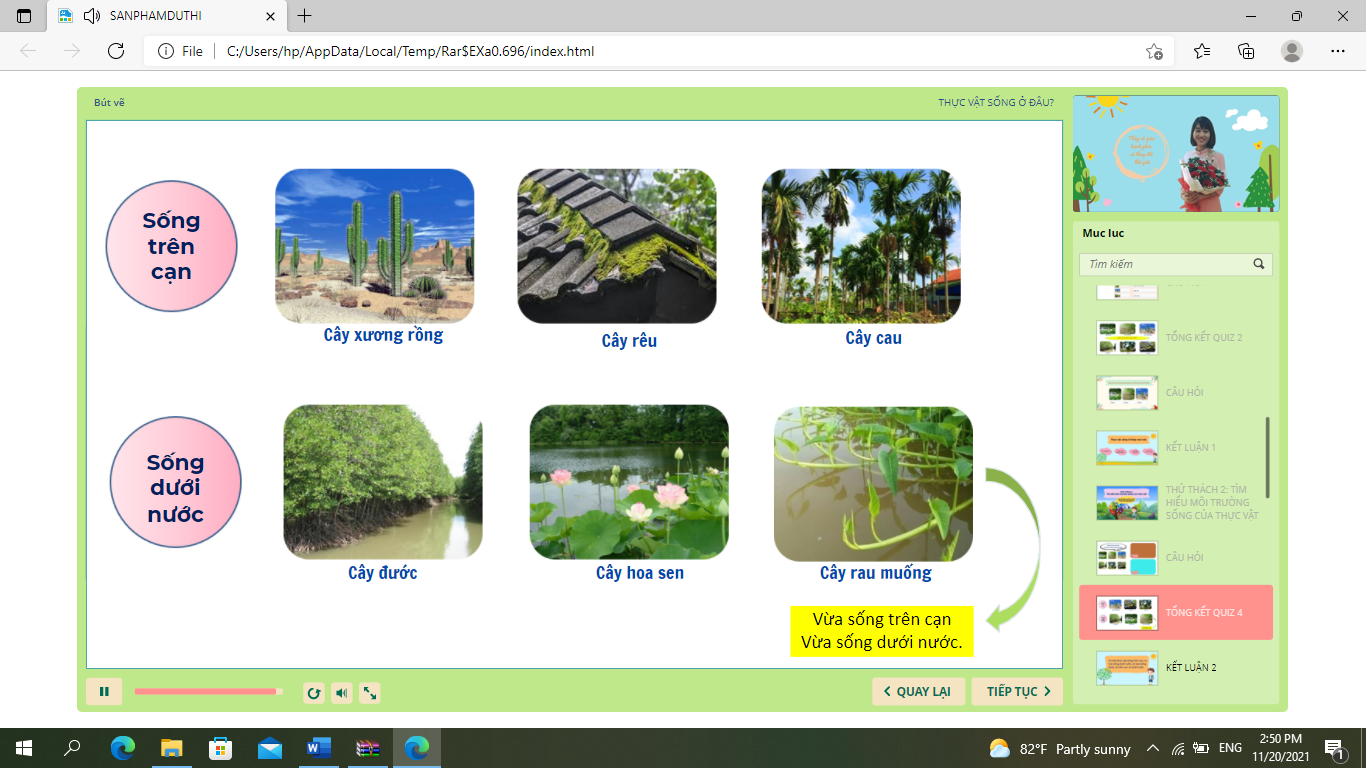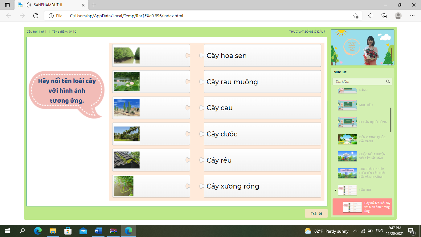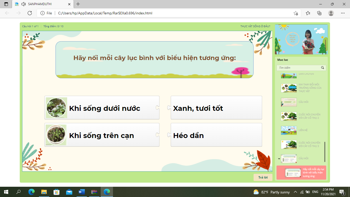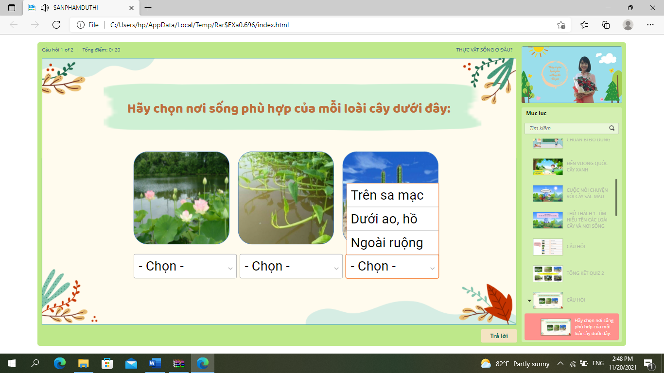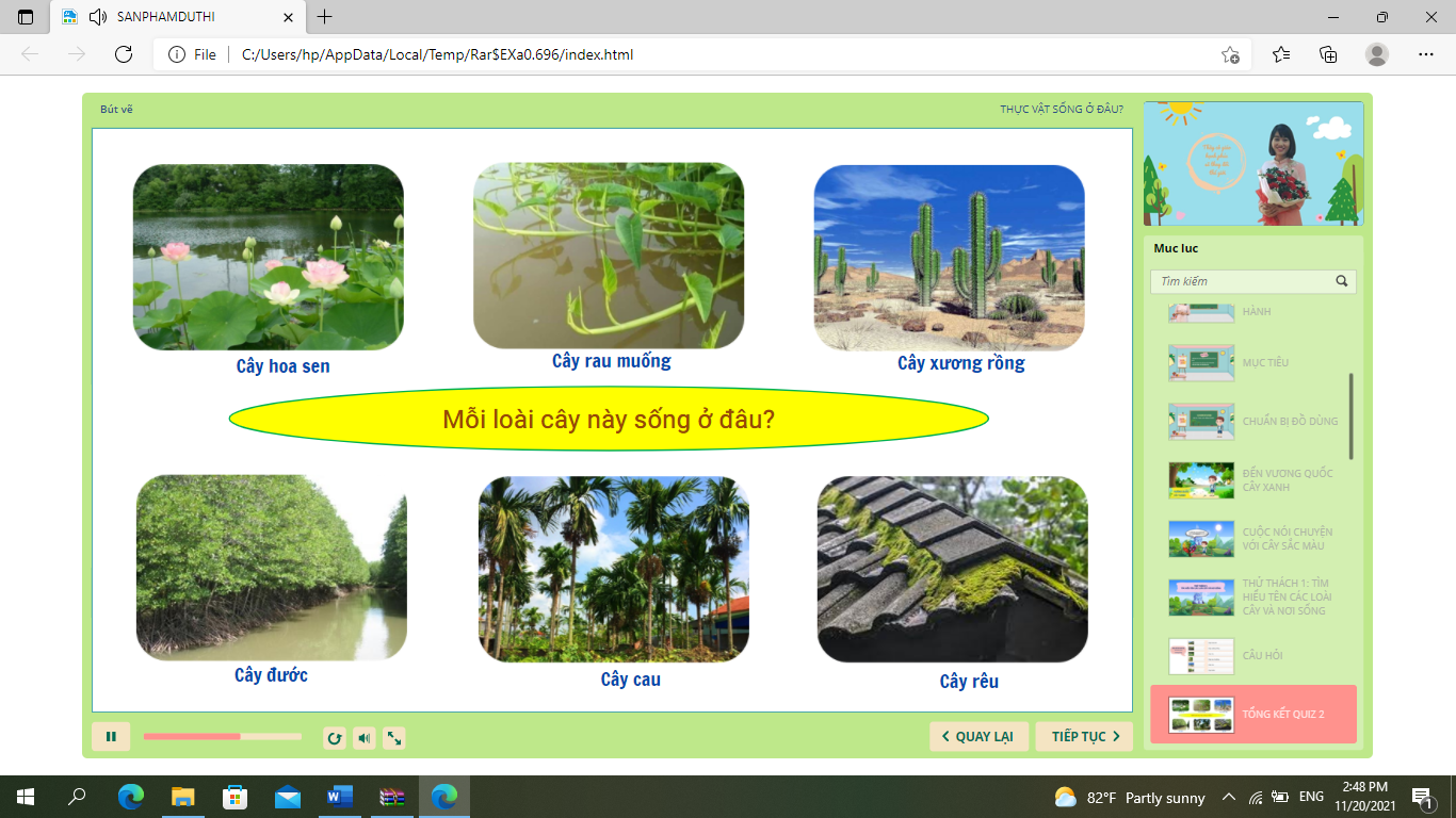 - HS thực hiện bài tập nối tên loài cây với hình ảnh tương ứng. HS ấn “ Trả lời” để gửi bài làm. - Sau khi tìm hiểu tên các loài cây, HS tiếp tục tìm hiểu về môi trường sống của các loài cây này. - HS thực hiện bài tập chọn nơi sống phù hợp với mỗi loài cây từ danh sách thả xuống. - Sau khi hoàn thành 2 bài tập, HS cùng cô giáo rút ra kết luận về nơi sống của thực vật. |
