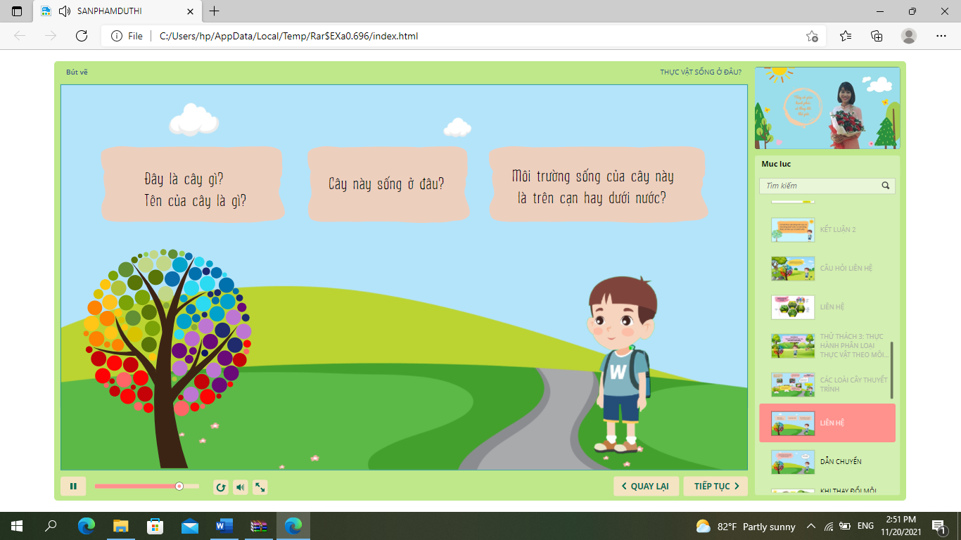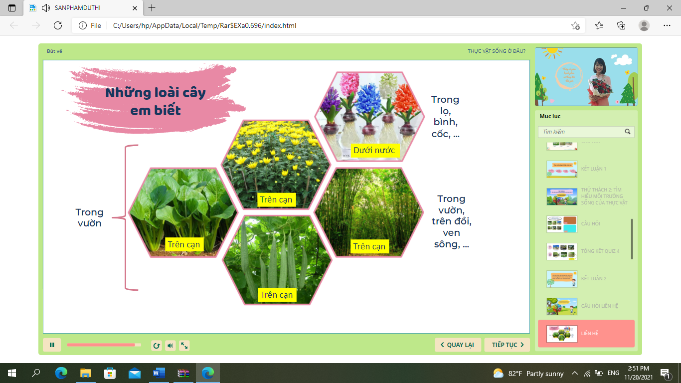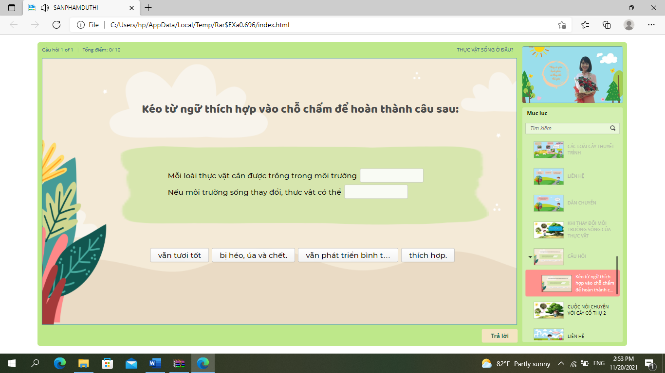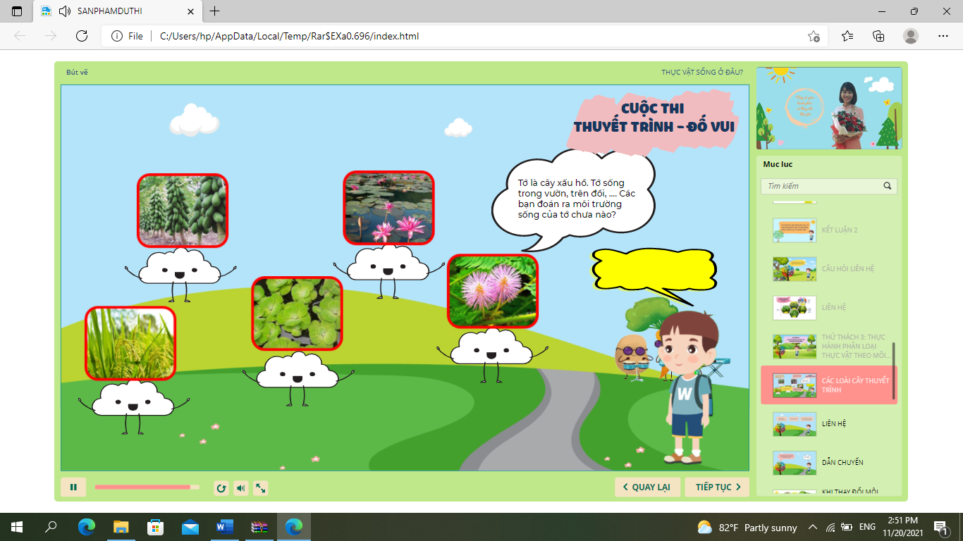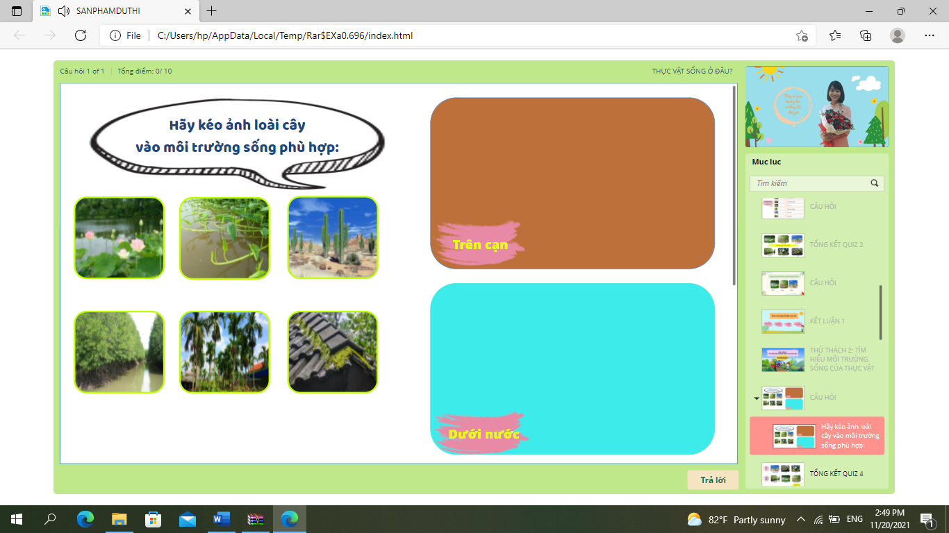 - HS thực hiện bài tập nối tên loài cây với hình ảnh tương ứng. HS ấn “ Trả lời” để gửi bài làm. - Sau khi tìm hiểu tên các loài cây, HS tiếp tục tìm hiểu về môi trường sống của các loài cây này. - HS thực hiện bài tập chọn nơi sống phù hợp với mỗi loài cây từ danh sách thả xuống. - Sau khi hoàn thành 2 bài tập, HS cùng cô giáo rút ra kết luận về nơi sống của thực vật. |