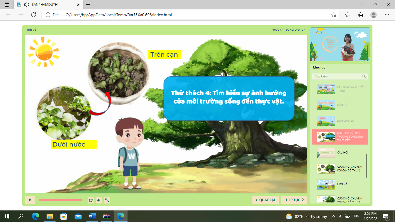 - Ở thử thách 4, Mít và các bạn HS tiếp tục gặp gỡ với cây cổ thụ của Vương quốc cây xanh. Cây cổ thụ dẫn dắt Mít và các bạn tìm hiểu về sự ảnh hưởng của môi trường sống đến thực vật. - HS thực hiện bài tập ghép đôi để nhận ra sự thay đổi của cây lục bình khi bị thay đổi môi trường sống từ dưới nước lên trên cạn. - Sau đó tiếp tục thực hiện bài tập kéo thả (điền từ ngữ vào chỗ trống) để rút ra kết luận về ảnh hưởng của môi trường sống đến thực vật. |
