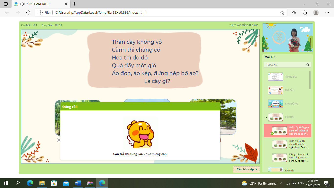 Giúp tạo tâm thế vui tươi, phấn khởi, ôn lại các kiến thức có liên quan. - Có 3 câu hỏi đố vui về cây cối, ở mỗi câu hỏi, GV đọc câu hỏi. HS nhấp chuột trái vào đáp án đúng hoặc sai rồi sau đó bấm vào chữ “Trả lời” ở góc phải màn hình. - Nếu trả lời đúng, HS nghe tiếng vỗ tay và thấy hình ảnh mặt cười. Nếu trả lời sai, HS nghe thấy âm thanh báo sai và thấy hình ảnh mặt mếu. - HS ấn “Câu hỏi tiếp” để chuyển câu hỏi. |