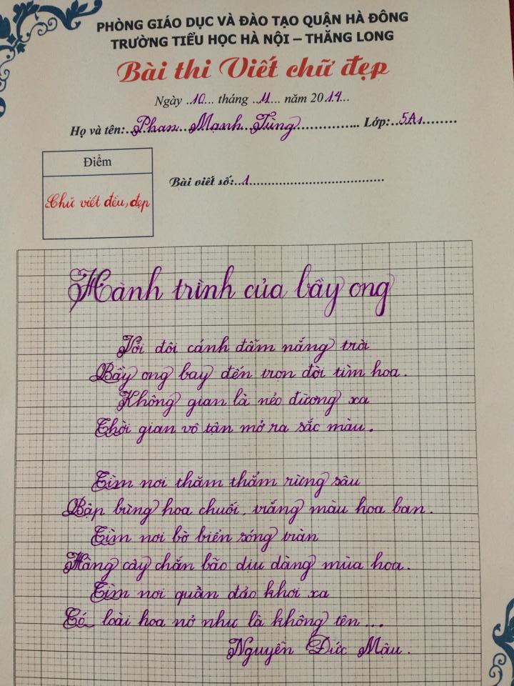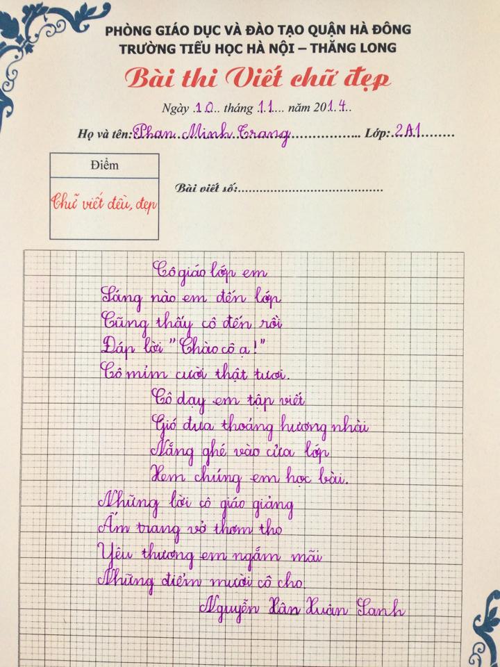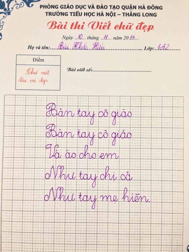 Các thầy cô rất vui mừng khi nhìn thấy sự tiền bộ vượt bậc của các con học sinh qua kì khảo sát viết chữ đẹp vừa qua. Đây là những món quà vô giá nhất mà các con giành tặng các thầy cô nhân ngày Nhà giáo Việt Nam. Chúc các con luôn học giỏi, chăm ngoan và không ngừng nỗ lực phấn đấu vươn lên. Các con là niềm tự hào của gia đình và nhà trường. Sau đây là các bài viết đạt giải nhất, những nét chữ đều và đẹp: