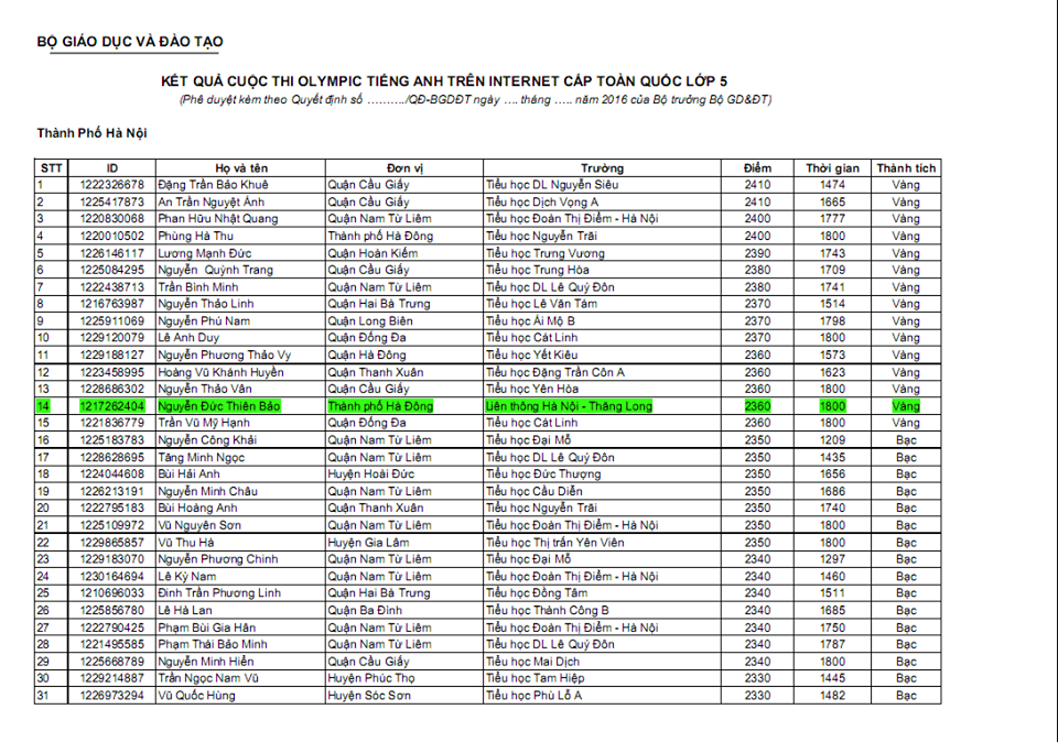 Sau bao ngày chờ đợi kết quả chính thức từ phía Ban tổ chức, đến hôm nay tin vui đã về tới trường rồi. Chúng ta hãy cùng chúc mừng bạn Nguyễn Đức Thiên Bảo - Học sinh lớp 5A1 đã đạt giải Vàng - Kì thi Olympic Tiếng Anh trên mạng cấp Quốc Gia (IOE) và chúc mừng bạn Vũ Ngô Hoàng Dương - Học sinh lớp 5A1 đã đạt giải Bạc - Kì thi giải Toán Violympic trên mạng cấp Quốc Gia. Bạn Nguyễn Đức Thiên Bảo (bên trái) và bạn Vũ Ngô Hoàng Dương (bên phải). [caption id="attachment_2799" align="aligncenter" width="799"]