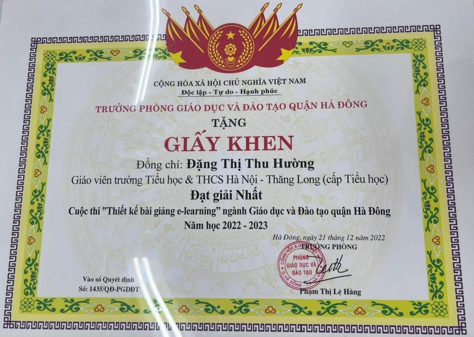 Ban Giám hiệu Trường Tiểu học và THCS Hà Nội - Thăng Long chúc mừng cô giáo Đặng Thị Thu Hường, giáo viên chủ nhiệm lớp 2M2, đã đạt giải Nhất (cấp tiểu học) cuộc thi “Thiết kế bài giảng e-learning” ngành Giáo dục và Đào tạo quận Hà Đông năm học 2022-2023.