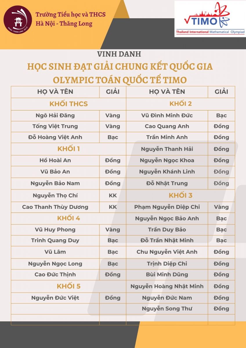 Chúc mừng 31 học sinh Trường Tiểu học và THCS Hà Nội - Thăng Long đã đạt giải trong vòng chung kết quốc gia kỳ thi Olympic Toán Quốc tế TIMO năm nay với