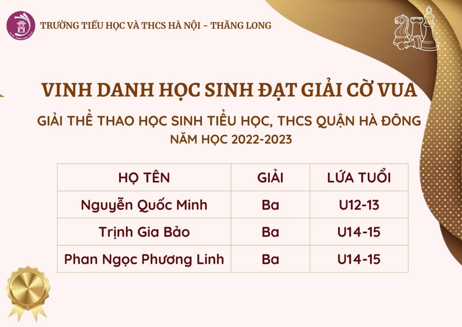 Xin chúc mừng 3 học sinh của Trường Tiểu học và THCS Hà Nội - Thăng Long đã giành được huy chương ở môn cờ vua của Giải thể thao học sinh tiểu học, THCS Quận Hà Đông năm học 2022-2023.