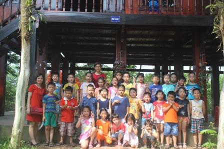 Học sinh lớp 1 chụp ảnh lưu niệm tại nhà sàn