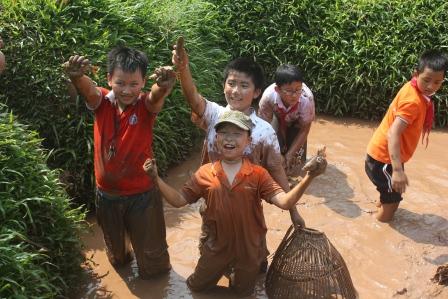 Bạn nào cũng lấm lem nhưng mà rất sung sướng khi bắt được cá