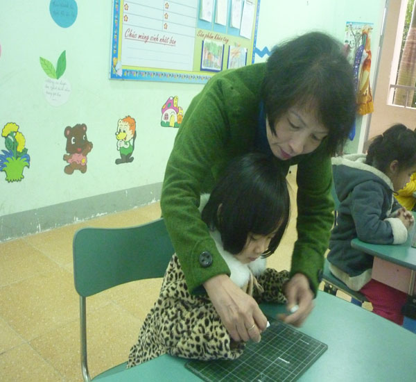 Cô Đỗ Thị Tuýt - 34 năm kinh nghiệm dạy lớp 1 đang cầm tay hướng dẫn