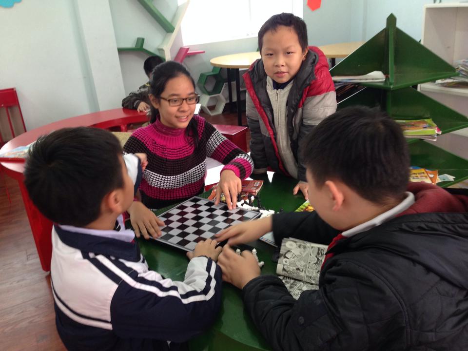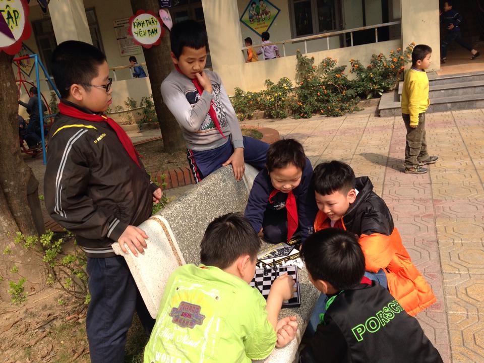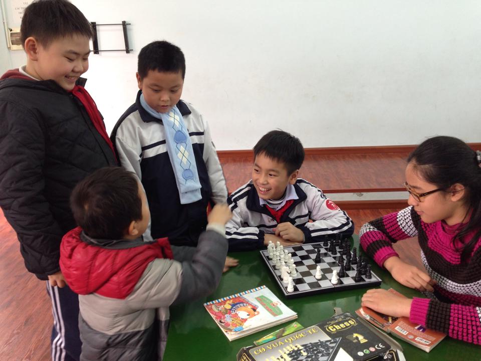 Các bạn lớp 4, 5 vừa chơi xong 1 ván cờ Vua đấy (Vinh Khánh 4A, kiện tướng cờ vua đứng cạnh bạn nữ)