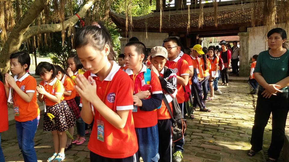 Từng nhóm học sinh chắp tay vái vọng trước cửa chùa