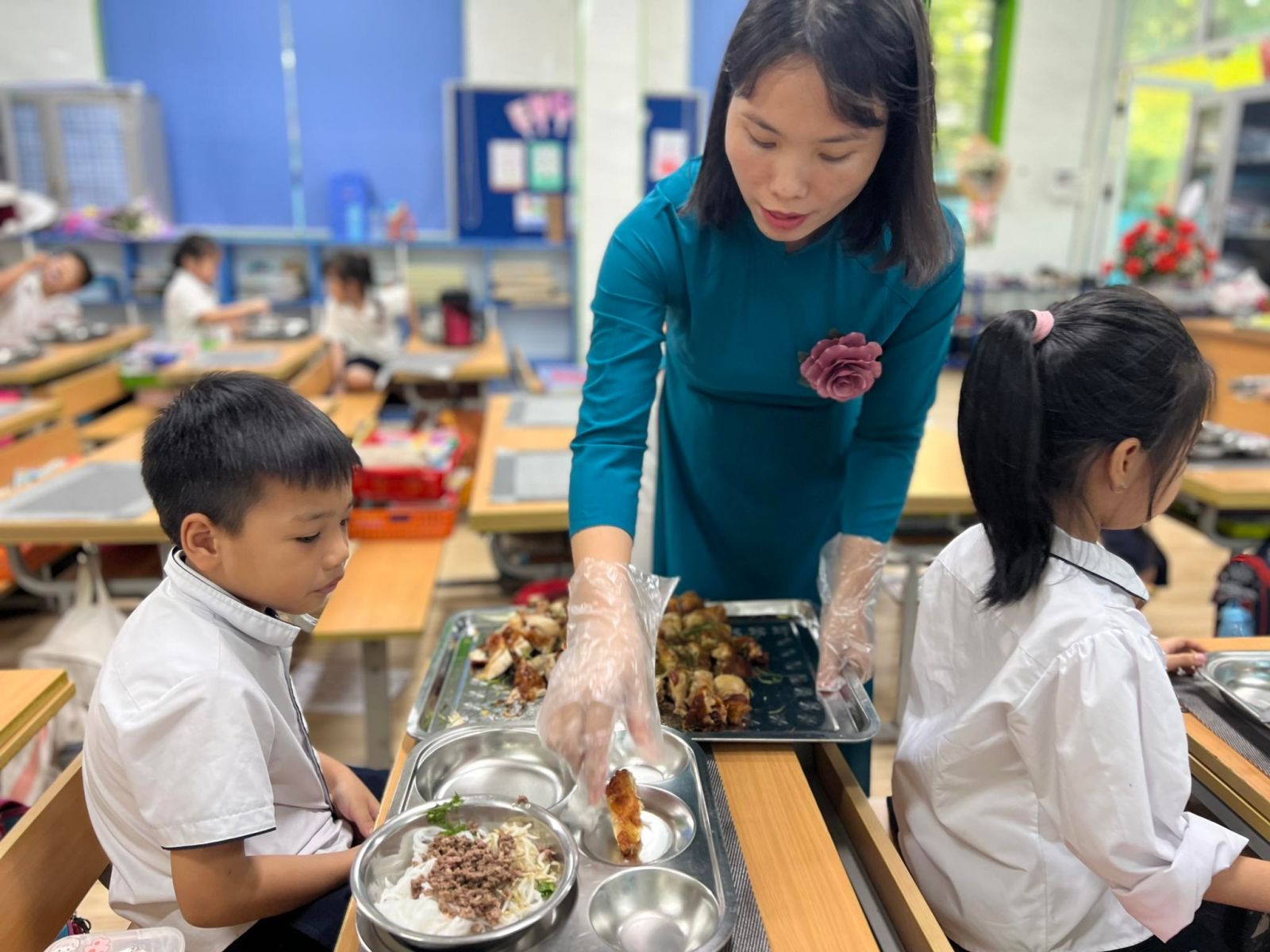 Và không gì tuyệt vời hơn khi các bạn được trải nghiệm ẩm thực Thanksgiving trong bữa trưa với món “gà tây” kiểu Việt Nam. Bạn nào cũng ngạc nhiên khi thấy một khay “gà tây nướng nguyên con” được trang trí màu sắc vô cùng bắt mắt và ngon tuyệt vời. Các bạn nhỏ hết sức thích thú và đều ăn hết suất ăn của mình.