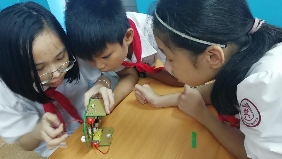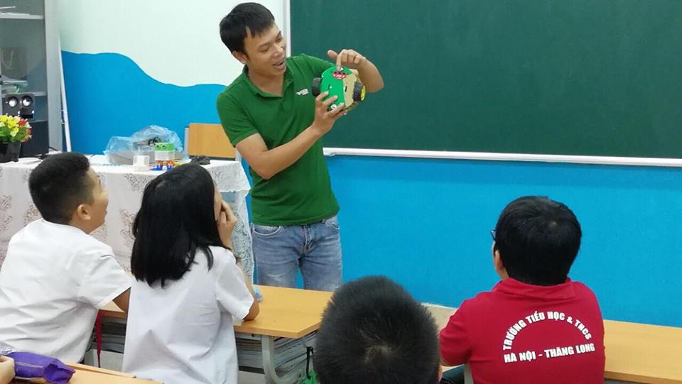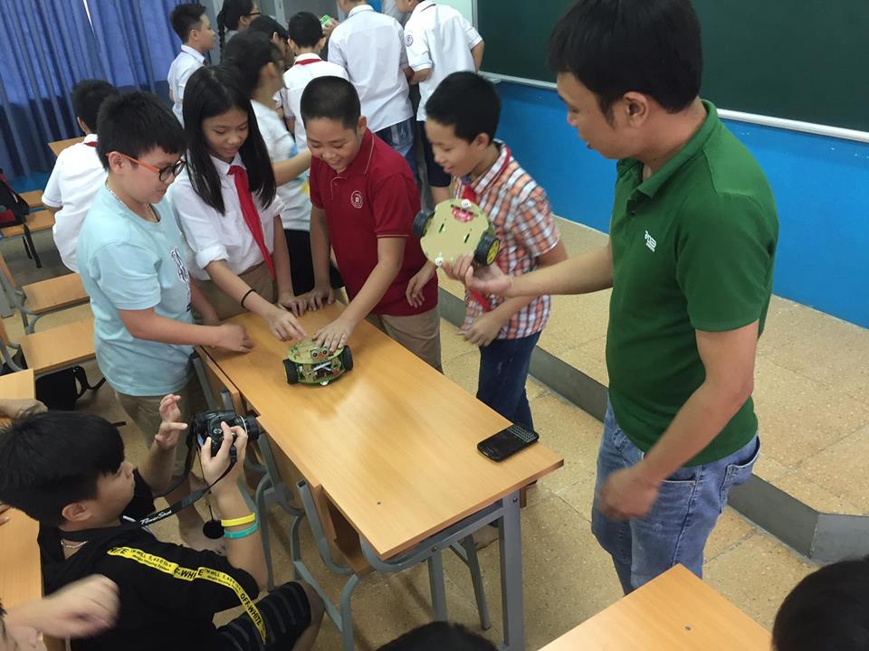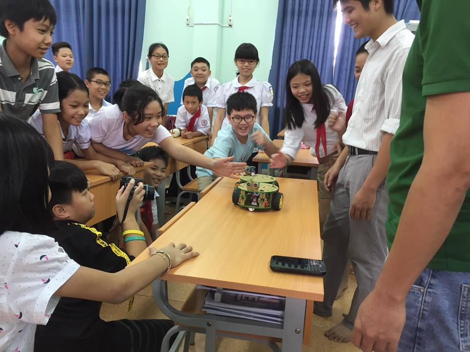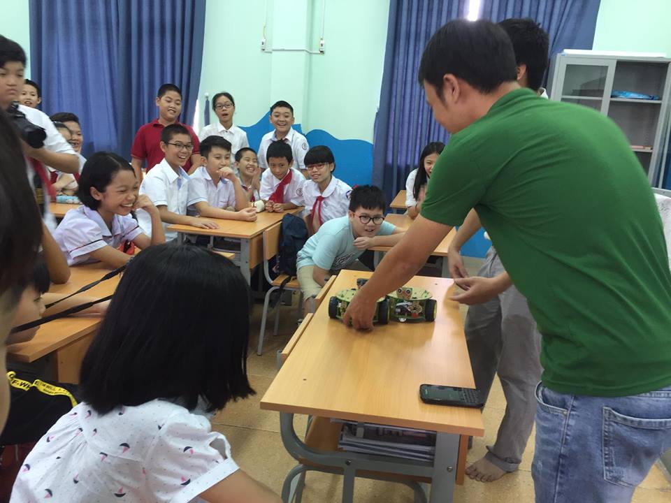KHƠI NGUỒN VÀ NUÔI DƯỠNG ĐAM MÊ Lần đầu tiên các bạn học sinh khối 6 được làm quen với lập trình. Các bạn vô cùng hào hứng trước sự thông minh của những con Robot. Rất nhiều câu hỏi được đặt ra: Sao nó có thể làm được như thế ạ thầy? Thưa thầy, nó chạy bằng gì ạ? Bên trong nó là cái gì mà nhiều dây xanh đỏ vậy thầy? Sao nó có thể tránh được nhau ạ? Mình có thể chế tạo ra nó không thầy? Cảm ơn các thầy đã khởi nguồn và truyền lửa cho các em ngay từ tiết học đầu tiên. Mong các em sẽ từng bước nuôi dưỡng niềm đam mê của mình!