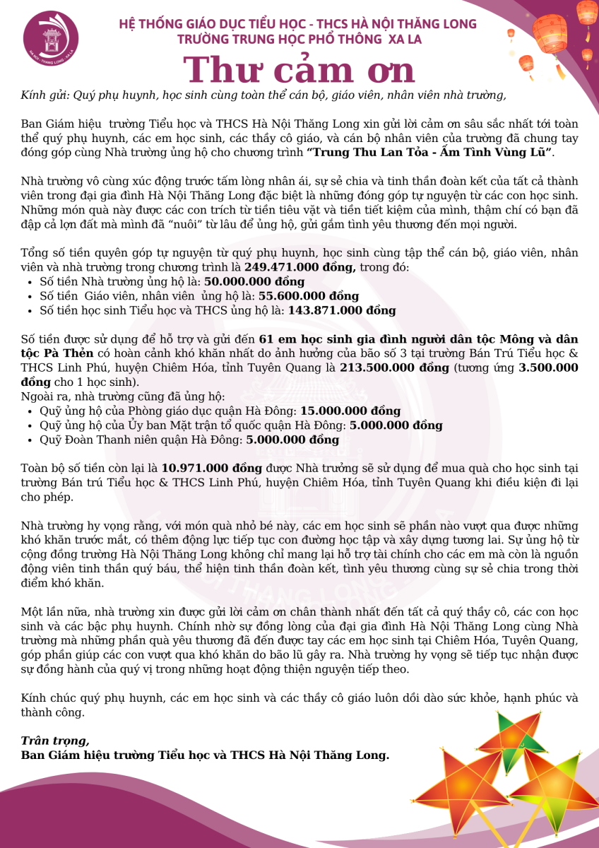 Ban Giám hiệu trường Tiểu học và THCS Hà Nội Thăng Long xin gửi lời cảm ơn sâu sắc nhất tới toàn thể quý phụ huynh, các em học sinh, các thầy cô giáo, và cán bộ nhân viên đã đóng góp cùng nhà trường để có khoản tiền ủng hộ cho chương trình “Trung Thu Lan Tỏa - Ấm Tình Vùng Lũ”.