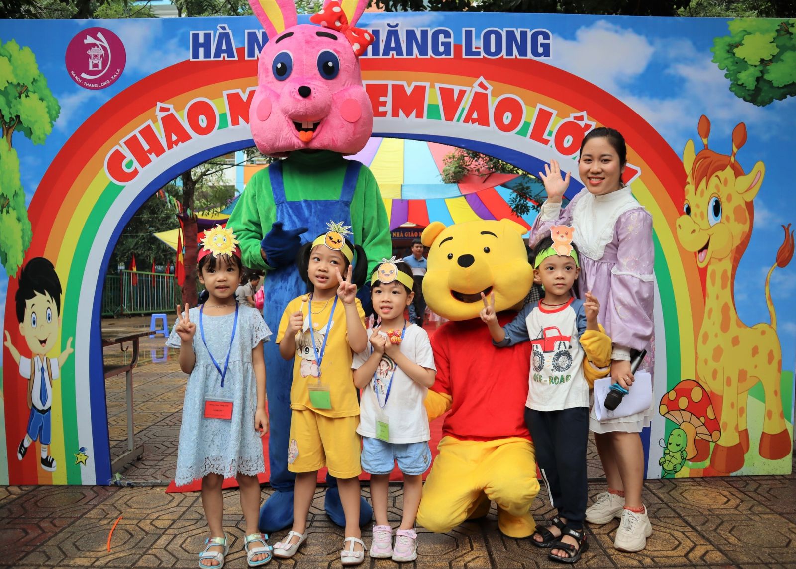 Để khởi động, các con hào hứng tham gia các trò chơi thú vị vận động thể lực và tư duy, chụp ảnh lưu niệm cùng hai bạn Thỏ hồng và Gấu Pooh…