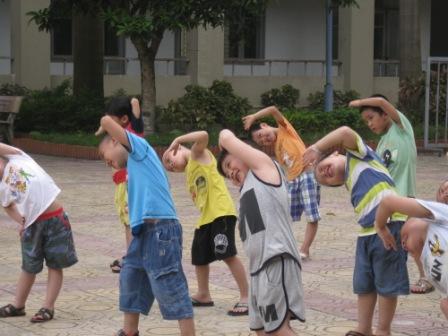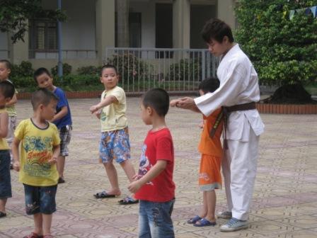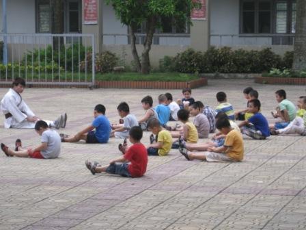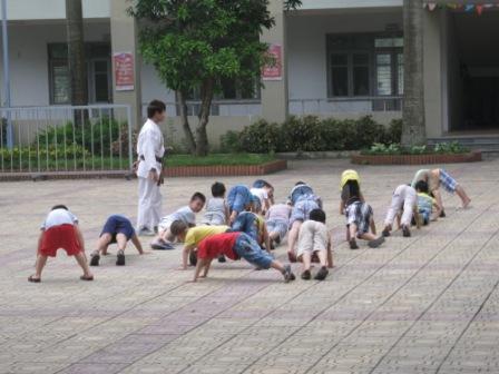 Các nam sinh CLB hành trang khởi động trong giờ học võ Ngoài ra võ thuật còn rất nhiều công dụng tuyệt vời khác như: Giúp con có kỹ năng tự vệ chính đáng, rèn luyện thể chất, nâng cao sức khỏe, chống bệnh tật, béo phì. Từ đó giúp con thêm nhanh nhẹn, hoạt bát và yêu thích các hoạt động tập thể. Võ thuật cũng giúp con rèn kỹ năng sinh hoạt theo nhóm, có thêm nhiều bạn bè. Việc luyện tập theo nhóm đòi hỏi con phải hợp tác với những người khác, và khi con bắt buộc phải làm những những điều như vậy, việc bắt đầu một cuộc trò chuyện sẽ trở nên dễ dàng và tự nhiên hơn.