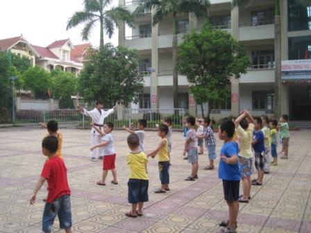 Thầy giáo đang điều chỉnh động tác cho từng học sinh