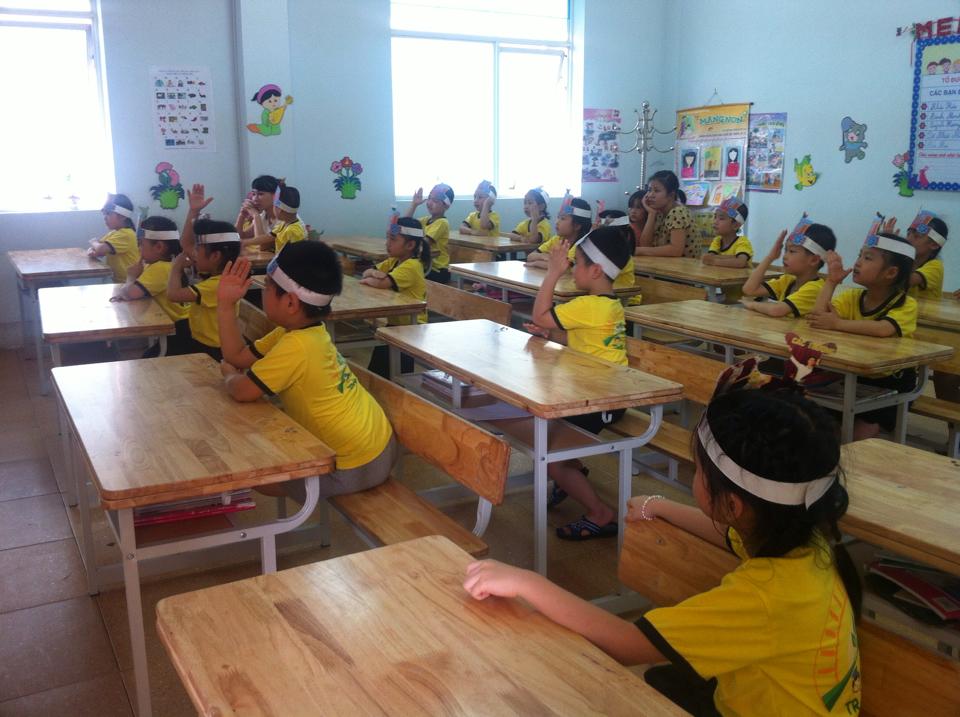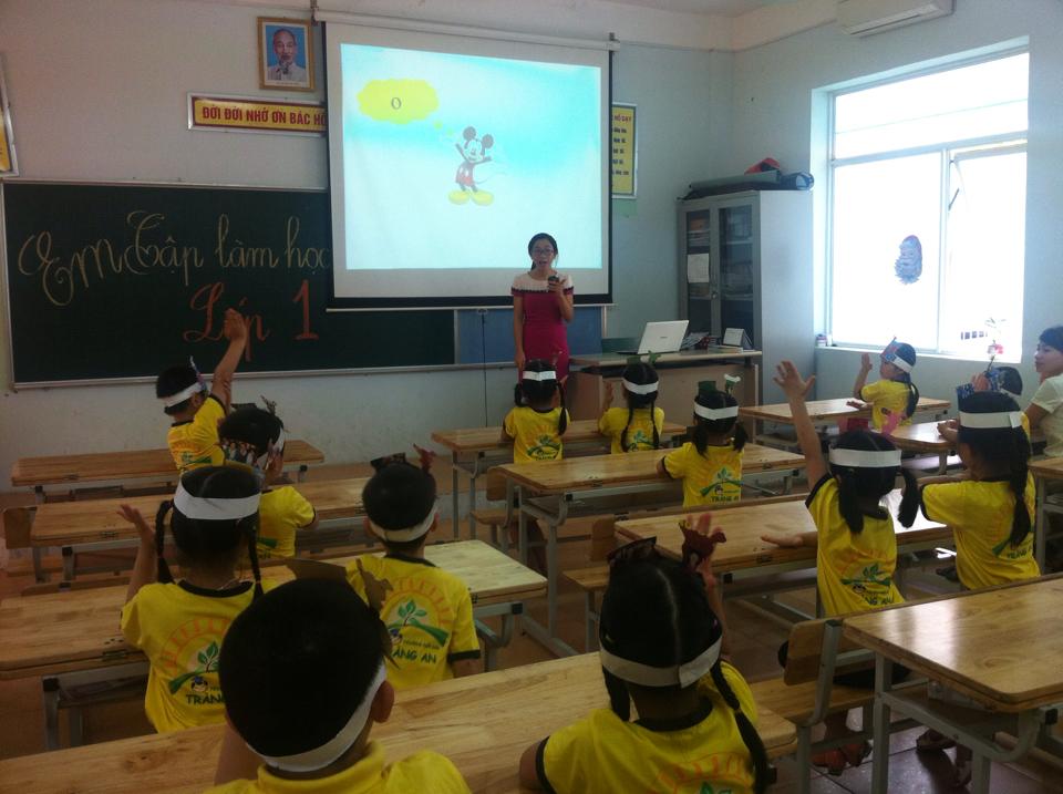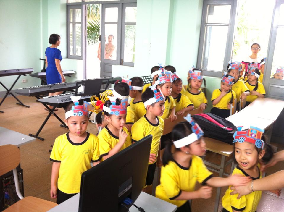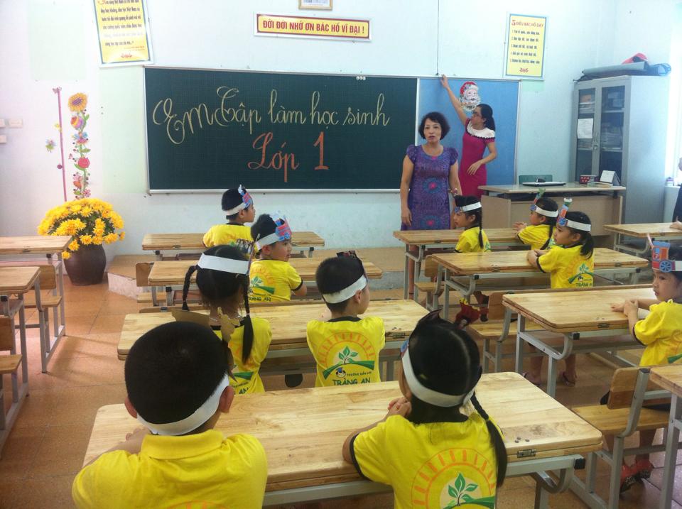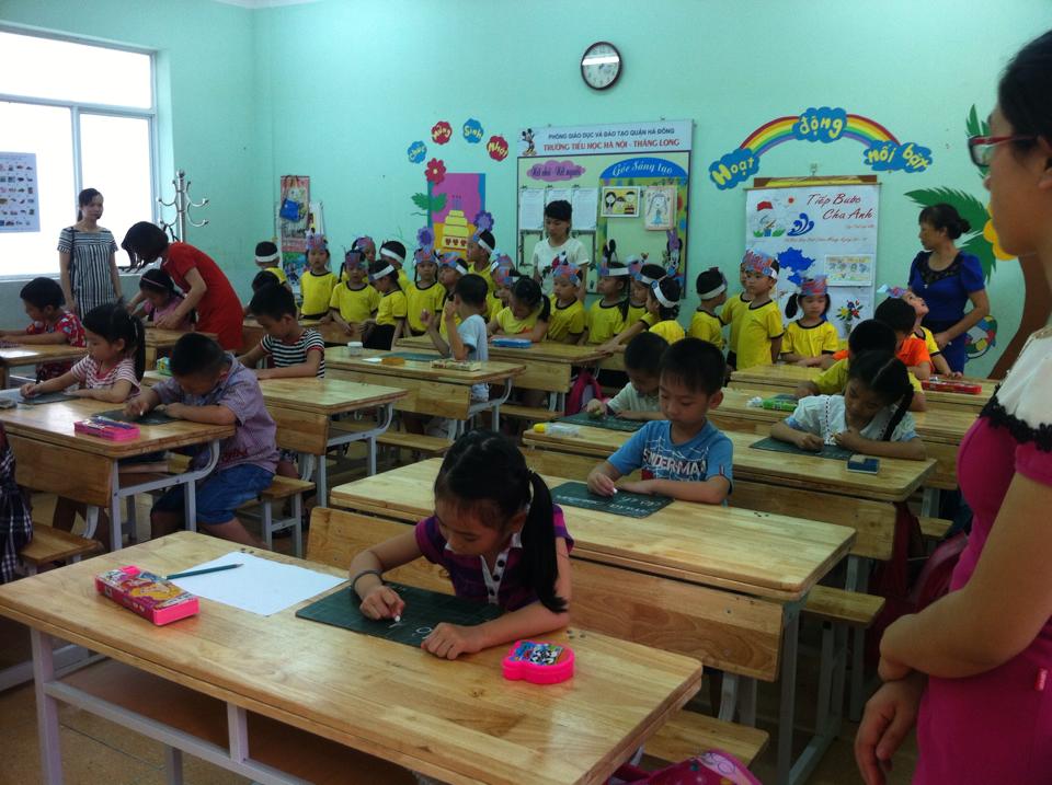 cac anh chị lớp lớn chào đón chúng con nưa cơ. Con thấy thích lắm ạ! Cô giáo bảo chúng con sẽ hoá thân thành những toa tàu để kết thành đoàn tàu bắt đầu khởi hành chuyến tàu "Em tập làm học sinh lớp 1". Đầu tiên, đoàn tàu chúng con được vào thăm thư viện. Các cô nói đây là thư viện mở nên chúng con có thể thoải mái chọn sách & truyện để đọc, rồi các cô còn chỉ cho chúng con nội quy trong thư viện như thế nào nữa! Sau này con đọc chữ giỏi con sẽ đọc thật nhiều thật nhiều sách. ^^ Sau đó đoàn tàu chúng con được đi cầu thang lên trên phòng học Âm nhạc và tin học, có nhiều đàn Organ và máy tính lắm ạ. Học lớp 1 thật là thú vị với bao nhiêu môn học mới lạ mẹ nhỉ! Rồi chúng con lại được vào hẳn trong lớp cùng học bài với các anh chị lớp 1 nữa. Các anh chị viết chữ đẹp quá ba mẹ ơi! Con cũng thích viết chữ đẹp như vậy ạ. Rồi cô giáo còn cho chúng con vào hẳn 1 lớp riêng để học bài thật luôn. Cô cho chúng con học cùng bạn chuột Mickey và vịt Donald nữa. Ôi thích quá đi! Cuối cùng bọn con được đi thăm quan nhà ăn của trường. Khác hẳn với ở trường Mầm non mẹ ạ, chúng con sẽ không ăn tại lớp nữa mà xuống nhà ăn ăn như các anh chị của trường. Nhà ăn thật rộng lơn hơn con tưởng tượng nhiều mẹ ah và thực đơn cũng thật hấp dẫn nữa ạ. Cô giáo bảo ở trường còn có rất nhiều trò chơi, những bài học, những tri thức bổ ích đang chờ chúng con sau cánh cổng trường Tiểu học. Con sắp vào lớp 1 thật rồi, con háo hức quá ba mẹ ơi! Tạm biệt trường Tiểu học Hà Nội - Thăng Long và hẹn gặp lại nhé!" Những hình ảnh Tập làm học sinh lớp 1 ở Trường Tiểu học Hà Nội - Thăng Long của các con: